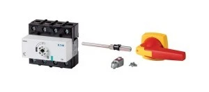 Eaton DMM, rozłącznik izolacyjny, DMM, 125 A, 3-biegunowy, Funkcja wyłączania awaryjnego, z czerwonym uchwytem obrotowym i żółtym pierścieniem blokującym, Z metalowym wałkiem do rozdzielnic o głębokości 400 mm