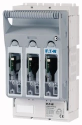 Trójpolowy rozłącznik bezpiecznikowy typu NH00 przeznaczony do montażu na szynach zbiorczych, stosowany do zabezpieczania obwodów zasilających w rozdzielniach przemysłowych i instalacjach energetycznych. Umożliwia szybkie odłączenie zasilania i kontrolę stanu wkładek bezpiecznikowych.