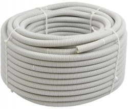 Rura instalacyjna, karbowana, giętka, nie rozprzestrzeniająca płomienia wykonana z PCV w kolorze szarym (RAL7035), ze stalowym pilotem ułatwiającym przeciąganie przewodów.