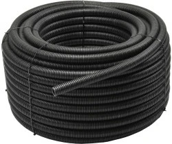 Rura instalacyjna, karbowana, giętka, nie rozprzestrzeniająca płomienia wykonana z PCV w kolorze czarnym, ze stalowym pilotem ułatwiającym przeciąganie przewodów.