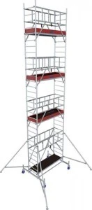 Masywne aluminiowe rusztowanie jezdne do wymagających zastosowań wyposażone w rolki z hamulcem oraz możliwością regulacji wysokości.