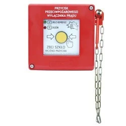 Przycisk przeciwpożarowego wyłącznika prądu jest przyciskiem uruchamianym pośrednio typu B (uruchomienie następuje po zbiciu szybki i wciśnięciu przycisku). Pod względem układu elektrycznego można go sklasyfikować jako zwykły przełącznik wyposażony w elektryczne elementy bierne pracujące w obwodzie sygnalizacji stanu alarmowania. Stan dozorowania sygnalizowany jest czerwoną diodą LED natomiast stan uruchomienia, po stłuczeniu szybki, jest sygnalizowany zieloną diodą LED. Sygnalizacja LED w zależności od sposobu podłączenia może być zasilana napięciem 24V AC/DC lub 230V AC. Człon łączeniowy zawiera dwa zestyki. Zestyk Y jest rozwarty w stanie dozorowania, a zwiera się w stanie alarmowania. Zestyk X działa odwrotnie.