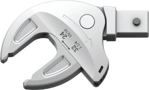 Samonastawny klucz płaski wtykowy, do nakrętek i śrub z łbem sześciokątnym, przeznaczony do stosowania z kluczami dynamometrycznymi z serii Click-Torque X i XP z uchwytem 14x18 mm. Pokrywa wszystkie wymiary metryczne i calowe w danym obszarze zastosowania. Bezstopniowo regulowane i równolegle prowadzone szczęki zastępują kilka pojedynczych wymiarów klucza płaskiego. Samoczynne dopasowanie do wymaganej wielkości po osadzeniu narzędzia na nakrętce lub śrubie sześciokątnej. Zintegrowany mechanizm dźwigni bezpiecznie zaciska śrubę sześciokątną lub nakrętkę pomiędzy szczękami, co znacznie zmniejsza ryzyko ześlizgnięcia i uszkodzenia. Mechanizm zapadkowy zapewnia szybkie i płynne dokręcanie bez przerywania. Zastosowanie pryzm w szczękach pozwala na uzyskanie kąta pracy wynoszącego zaledwie 30°.