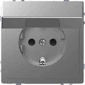 Merten, System Design, SCHUKO gniazdko elektryczne z klapką, z przesłoną torów prądowych, zaciski bezśrubowe, stal nierdzewna, to osprzęt serii Merten marki Schneider Electric Gniazdo wtykowego ma lśniące wykończenie powierzchni w kolorze stali nierdzewnej i posiada następujące wymiary: długość 71 mm, wysokość 45 mm, szerokość 71 mm. Gniazdo charakteryzuje się stopniem ochrony IP 20, prądem 16A / 250VAC. Do produkcji gniazda wykorzystano tworzywo termoplastyczne o zwiększonej odporności na promieniowanie UV. Produkt jest montowany podtynkowo i posiada zaciski bezśrubowe. Sposób montowania przez wkręty i szczypce.