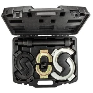 Ściągacz do sprężyn z wymiennymi końcówkami. 3 pary szczęk: 125/212 mm, 8/160 mm, 65/125 mm. BMW: E31 - E67, MINI R50|R52|R53, Fiat, Alfa Romeo, Chrysler, Lancia, Ford, Mazda, Honda, Hyundai, Jaguar, Jeep, Kia, Mercedes C/E, Citroen, Peugeot, Opel, Vauxhall, Saab, Renault, Nissan, Infiniti, Dacia, Mitsubishi, Rover, Subaru, Toyota, Audi, Porsche, Skoda, VW, Volvo. Do przednich i tylnych sprężyn. Szczęki posiadają plastikowe ochraniacze. System samoczynnego blokowania się na ściskanej sprężynie. Nadaje się do sprężyn stożkowych.