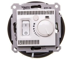 Regulator temperatury serii Sedna marki Schneider Electric do sterowania ogrewanien podłogowym za posrednictwem zewnętrzengo czujnika temperatury, to idealne rozwiazanie dla wszystkich którzy cenią sobie komfort. W sposób automatyczy steruje podłączonym grzejnikiem, utrzymując temperaturę pomieszczenia na żądanym poziomie. Nastawianie odbywa się w prosty i intuicyjny sposób za pomocą pokrętła znajdyjacego sie na panelu przednim. Załączenie napięcia sygnalizowane jest świeceniem sie zielonej lampki LED, natomiast załączenie ogrzewania wskazywane jest załączeniem LED o kolorze czerwonym. Wysoka jakość, wytrzymałość, niezawodność i bardzo dobrze parametry użytkowe to gwarantowane cechy wyrobów sygnowanych tą marką. Dzięki czytelnemu oznaczeniu podłączenie przewodów jest szybkie i proste. Ramka montażowa wykonana został z galwanizowanego metalu, zaś elementy plastikowe z tworzywa o zwiekszonej odporności na promienie UV. Gwarantowany stopień ochrony wynosi IP20. Maksymalne napięcie to 250V, zaś natężenie prądu nie może przekraczać 10AX. Aby skompletować instalację należy dokupić ramkę zewnętrzną Sedna.