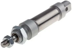 Podane wartości oporowe i nacisku powrotnego wynoszą 6 bar. Średnica 10 - 25 mm. Seria RS cylindrów ISO 6432 zapewnia wysoką wydajność i długi okres eksploatacji nawet w przypadku używania bez smarowania powietrza. Dostępne w wersji jedno- i dwustronnego działania, z tłokami z magnetycznej stali nierdzewnej we wszystkich modelach Ø12mm i wyższych. AISI 304 Obudowa ze stali nierdzewnej AISI 303 Drążek tłokowy ze stali nierdzewnej Łożysko z brązu spiekanego Wstępnie nasmarowane uszczelki NBR Anodyzowane pokrywki końcowe z aluminium Bufor zakończenia skoku Zakres ciśnień: 1-10 bar Temperatura otoczenia Zakres: Od -20°C do +80°C. Średnie: Sprężone powietrze, przefiltrowane, smarowane lub nie smarowane Dostarczana z nakrętką czołową i nakrętką tłoczyska