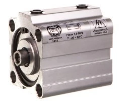 Pneumatyczne siłowniki dociskowe o krótkim skoku, stosowane w układach pneumatycznych jako elementy wkonawcze. Przeznaczone są do specyficznych zastosowań, zwłaszcza tam, gdzie jest ograniczone miejsce pod ich zabudowę. Posiadają importowane uszczelnienia poliuretanowe o najwyższej odporności na ścieranie, co w znacznym stopniu podwyższa ich trwałość oraz umożliwia pracę siłownika w warunkach bezsmarowychm przy suchym, oczyszczonym powietrzu, przy zachowaniu wysokiej trwałości i wytrzymałości. W siłownikach o średnicy D32 zastosowano najnowszy typ tłoka PNEUKO, który posiada amortyzator z tworzywa zabezpieczający przed uderzeniem w pokrywy oraz zintegrowany magnes. Pozwala to na stosowanie czujników pola magnetycznego (tzw. BSPT - Bezstykowa Sygnalizacja Położenia Tłoka). Siłownik z jednostronnym tłoczyskiem dwustronnego działania. Średnica siłownika: D50. Skok 25. Posiada BSPT. Maksymalne ciśnienie pracy: 1,0 MPa. Zakres temperatur pracy: od -20 do + 80°C. Zakres skoków roboczych: - dla siłowników dwustronnego działania: od 5 do 50 mm; - dla siłowników jednostronnego działania od 5 do max. 50 mm (uwaga: inne skoki wykonuje się na zamówienie). Pozycja pracy: dowolna. Sposób zasilania: przewodowo sprężonym powietrzem o maksymalnej wielkości cząstek stałych 10µm (nie wymaga smarowania) lub przewodowo sprężonym powietrzem o maksymalnej wielkości cząstek stałych 40µm, smarowanym mgłą olejową: 2 - 5 kropli/m?.