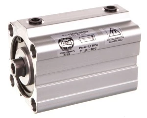 Pneumatyczne siłowniki dociskowe o krótkim skoku, stosowane w układach pneumatycznych jako elementy wkonawcze. Przeznaczone są do specyficznych zastosowań, zwłaszcza tam, gdzie jest ograniczone miejsce pod ich zabudowę. Posiadają importowane uszczelnienia poliuretanowe o najwyższej odporności na ścieranie, co w znacznym stopniu podwyższa ich trwałość oraz umożliwia pracę siłownika w warunkach bezsmarowychm przy suchym, oczyszczonym powietrzu, przy zachowaniu wysokiej trwałości i wytrzymałości. W siłownikach o średnicy D32 zastosowano najnowszy typ tłoka PNEUKO, który posiada amortyzator z tworzywa zabezpieczający przed uderzeniem w pokrywy oraz zintegrowany magnes. Pozwala to na stosowanie czujników pola magnetycznego (tzw. BSPT - Bezstykowa Sygnalizacja Położenia Tłoka). Siłownik z jednostronnym tłoczyskiem dwustronnego działania. Średnica siłownika: D50. Skok 50. Posiada BSPT. Maksymalne ciśnienie pracy: 1,0 MPa. Zakres temperatur pracy: od -20 do + 80°C. Zakres skoków roboczych: - dla siłowników dwustronnego działania: od 5 do 50 mm; - dla siłowników jednostronnego działania od 5 do max. 50 mm (uwaga: inne skoki wykonuje się na zamówienie). Pozycja pracy: dowolna. Sposób zasilania: przewodowo sprężonym powietrzem o maksymalnej wielkości cząstek stałych 10µm (nie wymaga smarowania) lub przewodowo sprężonym powietrzem o maksymalnej wielkości cząstek stałych 40µm, smarowanym mgłą olejową: 2 - 5 kropli/m?.