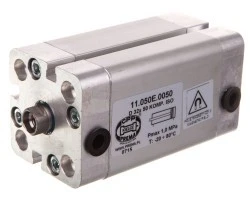 Siłowniki o zwartej budowie, dostosowane do montażu w miejscach o ograniczonej przestrzeni pod zabudowę. Zastosowane importowane uszczelnienia poliuretanowe o najwyższej odporności na ścieranie, co w znacznym stopniu podwyższa ich trwałość oraz umożliwia pracę siłownika w warunkach bezsmarowychm przy suchym, oczyszczonym powietrzu, przy zachowaniu wysokiej trwałości i wytrzymałości. Siłowniki standardowo wyposażane są w zabudowany element magnetyczny w tłoku, umożliwiający stosowanie czujników położenia (tzw. BSPT - Bezstykowa Sygnalizacja Położenia Tłoka). Siłowniki wystepują także w wersji z zabezpieczeniem przed obrotem tłoczyska i z gwintem zewnętrznym na tłoczysku. Do siłowników kompaktowych od D32 do D100 można stosować standardowe elementy mocujące od siłowników zgodnych z ISO 6431. Do siłowników kompaktowych należy stosować półprzewodnikowe czujniki położenia tłoka. Siłownik z jednostronnym tłoczyskiem dwustronnego działania. Średnica siłownika: D32. Skok 50. Posiada BSPT. Maksymalne ciśnienie pracy: 1,0 MPa. Zakres temperatur pracy: od -20 do + 80°C. Zakres skoków roboczych: - dla siłowników dwustronnego działania: od 5 do 250 mm; - dla siłowników jednostronnego działania od 5 do max. 50 mm (uwaga: inne skoki wykonuje się na zamówienie). Pozycja pracy: dowolna. Sposób zasilania: przewodowo sprężonym powietrzem o maksymalnej wielkości cząstek stałych 10µm (nie wymaga smarowania) lub przewodowo sprężonym powietrzem o maksymalnej wielkości cząstek stałych 40µm, smarowanym mgłą olejową: 2 - 5 kropli/m?.