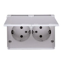 Simon 54 Gniazdo bryzgoszczelne podwójne z/uSchuko IP44 z przesłonami wersja skandynawska srebrny mat EGSZ2NZB/43
