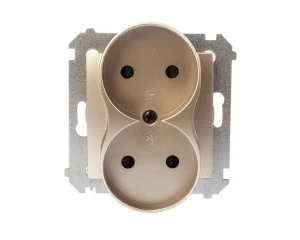 Gniazdo 2-krotne złote serii SIMON 54 Premium to podwójny model pochodzący z oferty asortymentowej firmy Kontakt-Simon - znanego polskiego producenta, będącego jednym z liderów w branży osprzętu elektroinstalacyjnego. Produkt ten jest niezbędnym elementem wykończeniowym w każdym pomieszczeniu, niezależnie od jego przeznaczenia, który służy do podłączenia urządzeń do wyodrębnionych sieci elektrycznych. Ten uniwersalny model wykonany został z mocnego tworzywa sztucznego, pokrytego emalią w złotym kolorze. Taka barwa dodaje mu elegancji i klasy. Gniazdo posiada miejsce na dwa wtyki.Model ten pracuje przy napięciu znamionowym 250 V i prądzie o natężeniu 16 A. Jego stopień ochrony to IP20, dlatego poleca się jego instalację w suchych miejscach we wnętrzu budynku. Gniazdo nie posiada bolca uziemiającego. Producent zaleca jego montaż podtynkowo, z pomocą śrubek i pazurków oraz dołączenie odpowiednio dopasowanej ramki z serii SIMON 54 Premium.