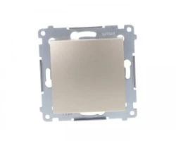 Produkt zawiera element podstawowy, który chroni centralna plakietka osłonowa. Przycisk jest jednobiegunowy i posiada 1 dźwignię, która odpowiada za działanie urządzenia. Produkt został wykonany z wysokiej klasy tworzywa termoplastycznego, które dzięki swoim właściwościom antystatcznym i uszlachetniającym nie pozwala osadzać się kurzowi, a także podtrzymuje trwałość koloru. Powierzchnia przycisku jest matowa, przez co delikatnie podkreśla jego ekskluzywny złoty kolor. Napięcie znamionowe w osprzęcie równe jest 250 V, a prąd znamionowy maksymalnie może osiągnąć 16 A. Montuje się go podtynkowo, szybko i w bardzo łatwy sposób przy użyciu pazurków i śruby. Produkt ma stopień ochrony IP20 i jest rekomendowany do pomieszczeń biurowych i mieszkalnych.