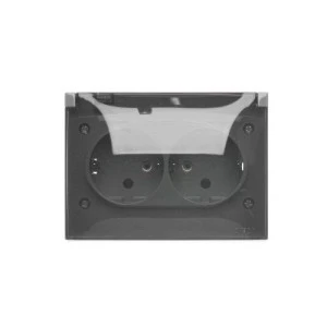 Simon Aquaclick Gniazdo natynkowe, Schuko, podwójne kompaktowe, klapka transparentna, IP44, zaciski śrubowe ciemnoszary