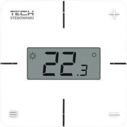 Przewodowy regulator R-S1 wyposażony jest w czytelny wyświetlacz z mechanicznymi przyciskami. Dodatkowo posiada czujnik wilgotności powietrza.