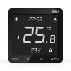 Przewodowy regulator R-S3 wyposażony jest w czytelny wyświetlacz z dotykowymi przyciskami i szklanym frontem. Dodatkowo posiada czujnik wilgotności powietrza oraz umożliwia pomiar temperatury podłogi (przy wykorzystaniu czujnika podłogowego NTC)