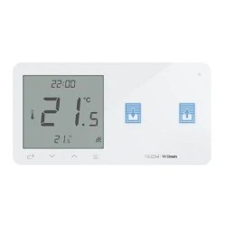 Rozbuduj swój system o inteligentny bezprzewodowy regulator temperatury! Regulator wyposażony jest w duży podświetlany wyświetlacz z dotykowymi przyciskami. Dodatkowo posiada czujnik wilgotności powietrza, a także umożliwia sterowanie temperaturą podłogi dzięki możliwości podpięcia przewodowego czujnika podłogowego NTC (brak w zestawie).