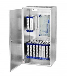 Skrzynka typu AIZ-210 jest przeznaczona do montażu sprzętu RTV/SAT w budynkach wielorodzinnych zgodnie z obowiązującymi przepisami budowlanymi. W skrzynce można zamontować jeden SWK-9216 MultiBAS oraz do ośmiu urządzeń rozszerzających: multiswitchy kaskadowych typu SMK-216x i wzmacniaczy STWK-810 w dowolnej konfiguracji (ostateczna liczba wzmacniaczy będzie zależała od bilansu energetycznego instalacji). Takie rozwiązanie pozwala dostarczyć sumę sygnałów RTV/SAT do 128 abonentów. Dodatkowo poprzez umieszczenie na obudowie SWK-9216 MultiBAS rozgałęźnika magistrali typu SSK-918 istnieje możliwość rozbudowy instalacji multiswitchowej o kolejne punkty odbiorcze. Skrzynka typu AIZ-210 jest przeznaczono do montażu na ścianie lub w szafach RACK-19”. Cechy produktu: możliwość montażu na ścianie, w szafie RACK-19, prefabrykowane otwory pod montaż urządzeń linii T-urbo-T, w standardzie gniazdo zasilania ~230V oraz zasilacz 12V/5A, wymiary szafki: 482 x 888,5 x 368mm.