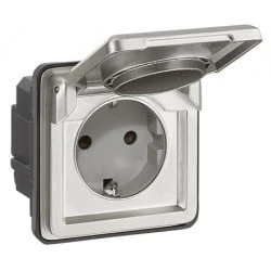 Gniazdo pojedyncze typu Schuko 16 A przeznaczone do montażu podtynkowego, wyposażone w klapkę ochronną i styk ochronny; zaprojektowane do stosowania tam, gdzie wymagane są podwyższona szczelność i odporność mechaniczna.