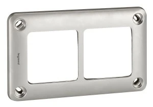 Ramka podwójna SOLIROC 077852 przeznaczona do montażu podtynkowego, zaprojektowana dla dwóch jednostek osprzętu elektrycznego. Wykonana z metalu, w kolorze chrom o matowym wykończeniu, z deklarowanym stopniem ochrony IP55.