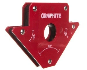 Spawalniczy kątownik magnetyczny GRAPHITE (nr ref. 56H902), umożliwia mocowanie spawanych elementów pod kątem 45? lub 90?. Silne magnesy ferrytowe przytrzymują spawane detale, przez co spawacz ma obydwie ręce wolne. Dodatkowy otwór pozwala na łatwe odrywanie magnesu po zakończeniu pracy.