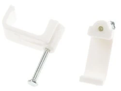 Podczas montażu zacisków należy stosować odpowiednie środki ochrony oczu. Kabel prostokątny - zaciski. Formowane zaciski kabli PVC do kabli dwuprzewodowych +ECC i potrójnych +ECC do montażu powierzchniowego. Komplet z utwardzonymi paznokciami.