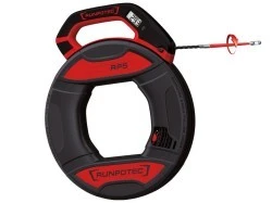 RP5 – RUNPOTEC Polyester Ø 5,5 mm to narzędzie do przeciągania kabli, wyposażone w cyfrowy licznik metrów (do pomiaru długości rur/kabli lub tworzenia odcinków kablowych). Trzykrotnie skręcana spirala ze specjalnego tworzywa sztucznego o średnicy Ø 5,5 mm charakteryzuje się jeszcze lepszymi właściwościami pchającymi niż pręt z włókna szklanego Ø 3 mm, a opór tarcia jest o połowę mniejszy dzięki punktowemu podparciu.