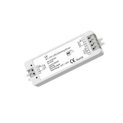 Odbiornik dedykowany do uzyskania kontroli nad instalacją składającej się z monochromatycznego oświetlenia LED posiadającego o maksymalnym prądzie wyjściowy rzedu 8A (np. taśma LED monochromatyczna). Urządzenie odbiorcze LV umożliwia dostęp do jednego wyjścia, do którego podłączone oświetlenie może być swobodnie ściemniane / rozjaśniane za pomocą ściemniacza 0/1-10V. Podstawową formą komunikacji sterownika LV jest przewodowe podłączenie z wejściem 0/1-10V do którego możemy podłączyć np. obrotowy panel naścienny bazujący na sterowaniu napięciem. Odbiornik LV wyróżnia się szerokim zakresem napięcia wejściowego oraz wyjściowego rzędu 5-36V oraz płynną pracą ściemniania PWM