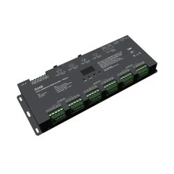 Sterownik LED DMX512 - Dekoder/Master DMX to osprzęt w formie sterownika LED posiadający dwadzieścia cztery wbudowane kanały dla których możemy określić indywidualne cyfrowe adresy i uzyskać dostęp do sterowania oświetleniem LED (wielokolorowym z barwą białą - RGB+W). Sterownik DMX512 D24B umożliwia zmianę trybu ściemniania w całym zakresie gammy 0.1 – 9.9. Natomiast dla czołowych instalacji opartych o oświetlenie LED, przygotowane zostały dwa gotowe tryby – liniowy oraz logarytmiczny. Sterowanie w przypadku dekoderów opartych o system DMX definiuje się jako zmiana jasności, koloru RGB czy temperatury barwowej CCT, bowiem każde wyjście może otrzymać przypisaną cechę do którego dostęp będzie realizowany wykorzystując jego uprzednio ustalony adres. Ponadto istnieje możliwość ustalenia częstotliwości PWM przez co w bezpośredni sposób możemy zmienić charakterystykę wykonywania pracy w zależności od potrzeby. Urządzenie sterujące D24B wyposażone w wiele zabezpieczeń, takich jak - zabezpieczenie zwarciowe, przeciążeniowe, termiczne czy odwróconej polaryzacji.