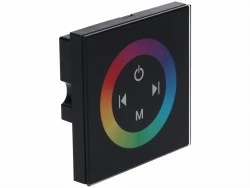 Sterownik do taśm RGB w formie czarnego szklanego panelu. Umożliwia wybór koloru