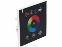 Sterownik do taśm RGB w formie czarnego szklanego panelu. Umożliwia wybór koloru