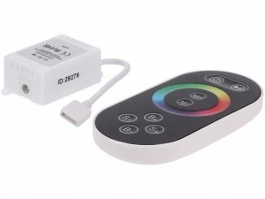 Sterownik do taśm RGB z pilotem radiowym w kolorze czarnym. Sterowanie koloremi jasnością. Małe wymiary sterownika.
