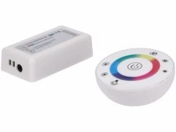 Sterownik do taśm RGB z okrągłym radiowym pilotem dotykowym w kolorze białym.Pozwala na sterowanie kolorem i jasnością.