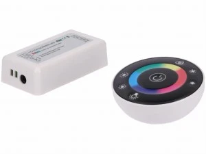 Sterownik do taśm RGB z okrągłym radiowym pilotem dotykowym w kolorze czarnym.Pozwala na sterowanie kolorem i jasnością.