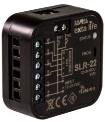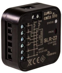 Sterownik SLR-22 to element końcowy systemu exta life przeznaczony do sterowania taśmami RGB lub RGBW, które zasilane są napięciem 12-24 VDC. Poza standardową funkcjonalnością jaką jest możliwość wyboru koloru oraz regulacja jasności sterownik oferuje funkcje dodatkowe takie jak tryb automatycznej, płynnej zmiany kolorów oraz zdefiniowane programy. Konfigurowalne czasy włączania, wyłączania, rozjaśniania/ściemniania oraz płynnej zmiany kolorów pozwalają lepiej dopasować działanie sterownika do wymagań użytkownika. Komunikacja dwukierunkowa z kontrolerem EFC-01 zapewnia wskazanie aktualnego stanu odbiornika, umożliwia zmianę jego wybranych parametrów oraz zdalne dopisywanie nadajników (bez dostępu do odbiornika). Algorytm kodowania ramek zapewnia bezpieczeństwo sterowania. SLR-22 poza kontrolerem może być równolegle sterowany z poziomu nadajników systemu exta life. Do odbiornika można wpisać większą liczbę nadajników co daje możliwość niezależnego sterowania z kilku miejsc. Urządzenie przeznaczone jest do montażu w puszkach instalacyjnych pod- i natynkowych. Dodatkowe wejścia przewodowe z możliwością konfiguracji zwiększają funkcjonalność sterowania. Odbiornik posiada zaimplementowaną funkcję zdalnej aktualizacji oprogramowania z poziomu kontrolera.