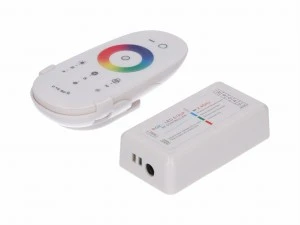 Sterownik do taśm RGBW z radiowym pilotem dotykowym w kolorze białym i uchwytem. Pozwala na sterowanie kolorem, jasnością oraz zmianę scen oświetlenia.