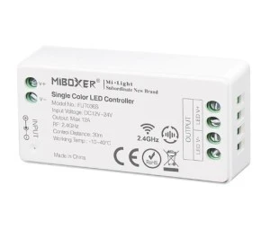 FUT036S to odświeżona wersja popularnego kontrolera FUT036M. Kontroler LED został rozbudowany o możliwość zmiany częstotliwości modulacji PWM oraz nowe funkcje dynamiczne. Dodatkowo kontroler ten posiada funkcję przekazywania i synchronizacji sygnału, co przy zachowaniu 30m odstępów pomiędzy kolejnymi urządzeniami, pozwala uzyskać nieskończony zasięg. Parametry pracy kontrolera synchronizują się automatycznie z innymi produktami znajdującymi się w grupie, pozwala to na uzyskanie identycznego efektu oświetlenia nawet wtedy kiedy produkty zostaną uruchomione w innym czasie. Moc kontrolera została zwiększona do 12A (144W przy instalacji 12V i 288W przy instalacji 24V). Wbudowaną dioda sygnalizacyjna, pozwala na szybką diagnozę oraz przypisanie kontrolera do pilota bez podłączania taśmy LED.