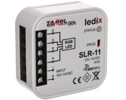 Sterownik RGB SLR-11 przeznaczony jest są do sterowania diodami LED RGB w układzie wspólny „+” (taśmy oraz moduły RGB, oprawy RGB serii LEDIX). Sterowanie odbywa się radiowo na częstotliwości 868 MHz. Fabrycznie sterownik wyposażony jest w 5 programów sterowania diodami, a użytkownik ma do wyboru 10 kolorów świecenia diod ustawionych fabrycznie. Przy współpracy SLR-11 z pilotem P-260 możliwa jest zmiana kolorów świecenia w sposób płynny (RAINBOW). Sterowanie kolorami prowadzone jest za pomocą modulacji PWM z rozdzielczością 9-bit. Niewielkie wymiary sterowników umożliwiają bezpośredni ich montaż w standardowej puszcze ?=60 mm.