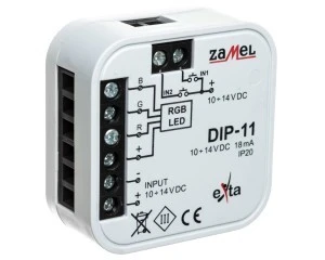 Sterownik DIP-11 przeznaczony jest do przewodowego sterowania diodami LED RGB w układzie wspólny + (oprawy standardowe RGB serii LEDIX, taśmy i moduły RGB) zasilanymi napięciem 10 ÷ 14 V DC. Sterowanie prowadzone jest z poziomu typowych przycisków zwiernych (dzwonkowych) lub łączników rolecianych.