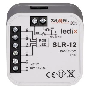 Sterownik RGB SLR-12 przeznaczony jest do sterowania diodami LED RGB w układzie wspólny „+” (taśmy oraz moduły RGB, oprawy RGB serii LEDIX). Sterowanie odbywa się przewodowo za pomocą przycisków zwiernych podłączonych do wejść IN1, IN2. Fabrycznie sterownik wyposażony jest w 3 programy sterowania diodami. Użytkownik ma do wyboru 10 kolorów świecenia diod ustawionych fabrycznie z możliwością płynnego rozjaśniania/ściemniania. Dostępny jest także program płynnej, automatycznej zmiany kolorów (FLOATING) z czasem zmian ustawionym w 10 krokach. Sterowanie kolorami prowadzone jest za pomocą modulacji PWM z rozdzielczością 9-bit. Niewielkie wymiary sterowników umożliwiają bezpośredni ich montaż w standardowej puszcze ?=60 mm.