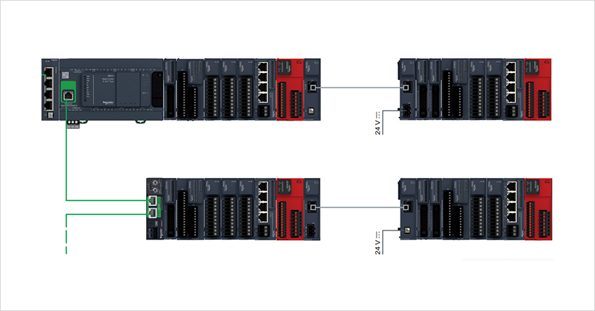 Modicon M262 dostarcza możliwość korzystania kilku sieci w ramach jednego sterownika. W praktyce pierwsza siećmoże służyć do obsługi aplikacji, kolejna do połączenia kilku maszyn ze sobą, a trzecia do komunikowania się zsystemem zarządzania całym procesem. Obsługa wielu sieci pomaga uniknąć problemu przeciążeń na łączu, copozytywnie wpływa na wydajność maszyn użytkowników końcowych.