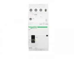 Stycznik modułowy iCT50r25-30-230 25A 3NO 50/60Hz 220/240 VAC ,o numerze A9C21833. Optyczny wskaźnik stanu styków wyjściowych, możliwość rozbudowy o styki pomocnicze Jest to urządzenie zdalnego sterowania Prąd znamionowy wynosi 25A Napięcie robocze wynosi 400 VAC, a napięcie sterujące to 220 VAC do 240 VAC. Wytrzymałość elektryczna sięga do 100000 cykli dla AC-7A lub AC-1, 30000 cykli dla AC-7C, AC-3, AC-5A lub AC-5B. Maksymalna liczba operacji przełączania to 6 na minutę. Stopień ochrony to IP20 i IP40 w obudowie. Jest montowany na szynie DIN. To urządzenie może być używane do zdalnego przełączania obciążeń oświetleniowych, małych silników (wentylatory, miksery) lub aplikacji systemów HVAC. Jest kompatybilny ze wszystkimi pomocniczymi urządzeniami sterującymi Acti 9, do zastosowań związanych z oświetleniem, ogrzewaniem i wentylacją. Ten produkt jest zgodny z normą IEC/EN 61095.