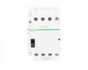 Stycznik modułowy iCT50r40-30-230 40A 3NO 50/60Hz 220/240 VAC ,o numerze A9C21843. Optyczny wskaźnik stanu styków wyjściowych, możliwość rozbudowy o styki pomocnicze Prąd znamionowy wynosi 40A Wytrzymałość elektryczna sięga do 100000 cykli dla AC-7A lub AC-1, 30000 cykli dla AC-7C, AC-3, AC-5A lub AC-5B. Maksymalna liczba operacji przełączania to 6 na minutę. Stopień ochrony to IP20 i IP40 w obudowie. Jest montowany na szynie DIN. To urządzenie może być używane do zdalnego przełączania obciążeń oświetleniowych, małych silników (wentylatory, miksery) lub aplikacji systemów HVAC. Jest kompatybilny ze wszystkimi pomocniczymi urządzeniami sterującymi Acti 9, do zastosowań związanych z oświetleniem, ogrzewaniem i wentylacją. Ten produkt jest zgodny z normą IEC/EN 61095.
