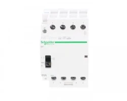 Stycznik modułowy serii iCT, o numerze A9C21864, iCT50r-63-40-230, napięcie sterowania 220/240 VAC 50Hz, 4 styki zwierne, prąd znamionowy AC7A: 63 A, do sterowania obwodami elektrycznymi. Wyposażony w dźwignię ręcznego sterowania Załączony-Auto-Wyłączony pozwalający na lokalne sterowanie. enterOptyczny wskaźnik st anu styków wyjściowych, możliwość rozbudowy o styki pomocnicze