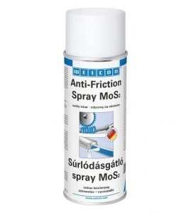 WEICON Anti-Friction Spray MoS2 w sprayu 400 ml to antracytowo-czarny, suchy smar na bazie MoS₂ o zapachu rozpuszczalników i bardzo wysokiej odporności termicznej od −200 do +450 °C (krótkotrwale do +500 °C), który wysycha po 2–3 minutach, osiąga pełną wytrzymałość po 0,5 h, a jego okres przydatności wynosi 24 miesiące.