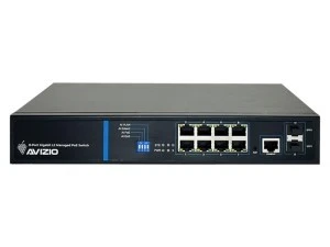 Switch zarządzalny od AVIZIO wyposażony w 11 portów RJ45 z podziałem na 8 portów RJ45 PoE 1 Gb/s, 2 porty RJ45 SFP Uplink 1 Gb/s oraz 1 port konsolowy.