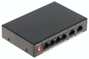 PFS3006-4ET-60-V2 to wysokiej jakości switch PoE należący do marki Dahua. Urządzenie zostało zaprojektowane pod kątem realizacji systemów monitoringu IP. Całkowity budżet zasilania dla podłączonych urządzeń wynosi 60W. Urządzenie wspiera standardy IEEE 802.3af, IEEE 802.3at oraz Hi-PoE (pierwszy port). Switch posiada na wyposażeniu 4 porty RJ45 10/100Mbps z obsługą technologii PoE 802.3af/at oraz 2 porty RJ45 Uplink 10/100Mbps.