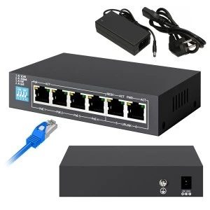 Jest to 6 portowy niezarządzany przełącznik z 4 portami PoE - z maksymalną prędkością 100 Mb/s i z obsługą standardów IEEE 802.3af/at - z maksymalną mocą na jeden port do 30W. Switch posiada również 2 porty RJ45 - bez opcji zasilania PoE. Porty te mogą służyć jako porty Uplink lub do podłączenia dodatkowych urządzeń np. rejestratora wideo w zastosowaniach monitoringowych.
