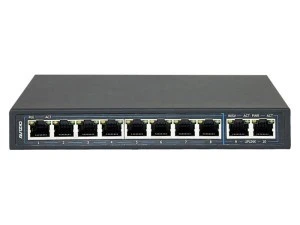 Switch niezarządzalny od AVIZIO wyposażony w 10 portów RJ45 z podziałem na 8 portów RJ45 PoE 1 Gb/s oraz 2 porty RJ45 Uplink 1 Gb/s.