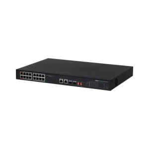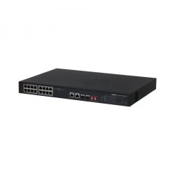 PFS3218-16ET-135 to wysokiej jakości ekonomiczny switch PoE przeznaczony do budowy systemów monitoringu IP, wyposażony w 16 portów RJ45 10/100Mbps z obsługą technologii PoE 802.3af/at (power over ethernet) oraz 2 porty RJ45 Uplink 1 Gbps współdzielone (Combo) z 2 portami na wkładki SFP. Całkowity budżet zasilania PoE dla podłączonych urządzeń wynosi 135W. Ponadto, urządzenie wspiera